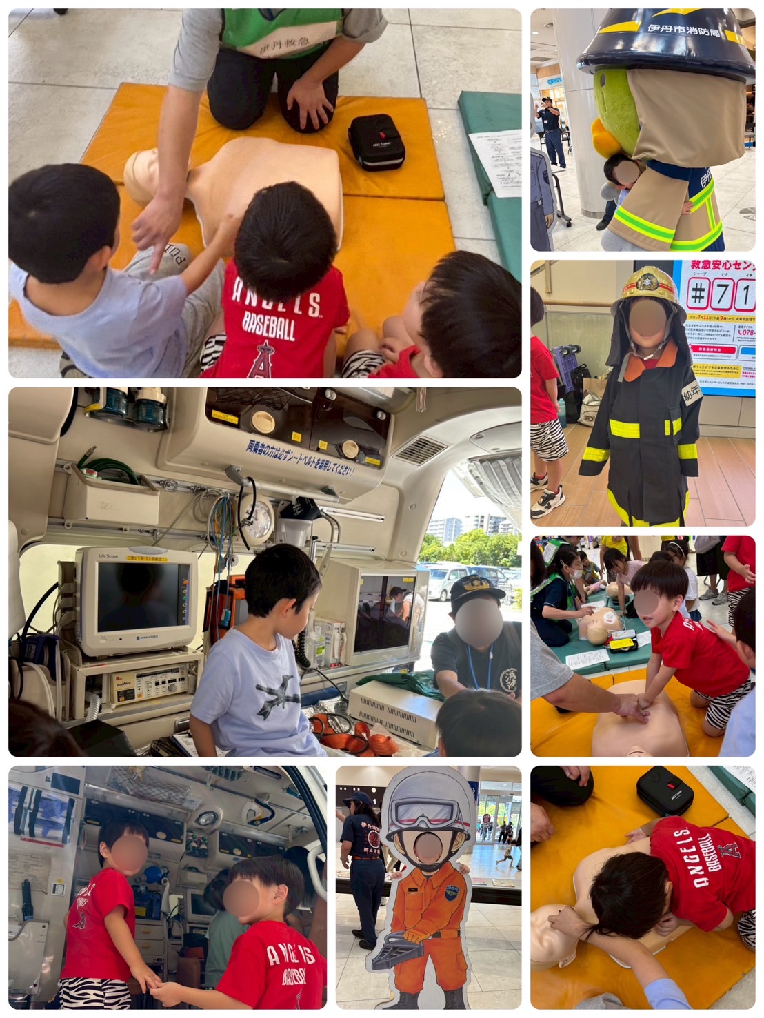 実際に子どもたちが救急車の車内に入り、「ここには何があるのー?」と質問をしていました。心配蘇生の方法を教えていただいたり、ちびっこ消防士の衣装を着せていただいたりと盛りだくさんの内容でした。